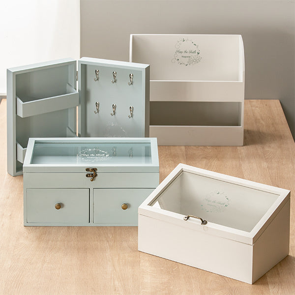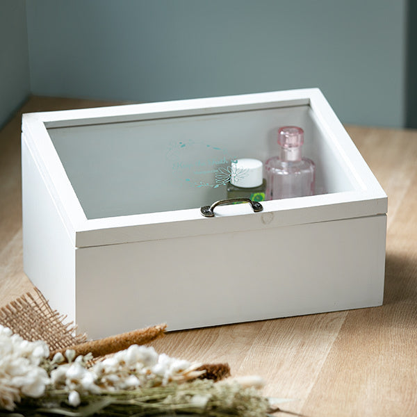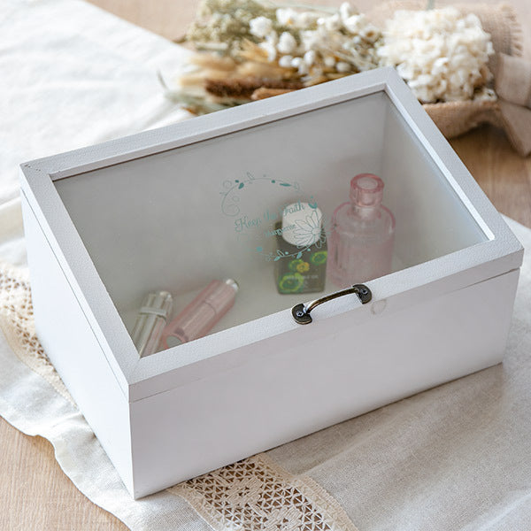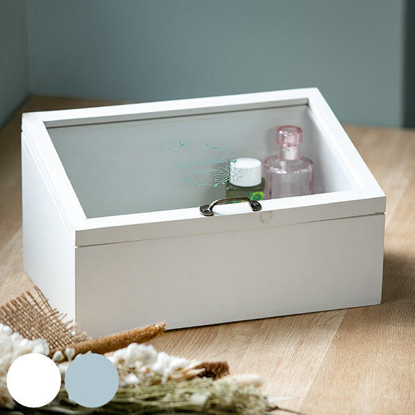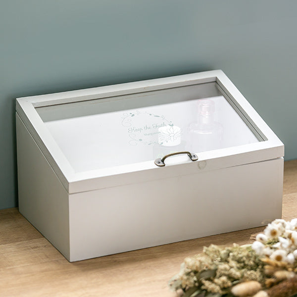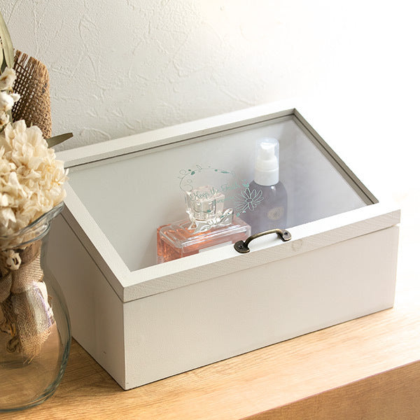 ホコリを防いでくれるガラス製の蓋 ガラス製の蓋がついており、中に入れているものをホコリ等から守ってくれます。マスクやハンカチ等を入れておくと、ホコリを防ぎ衛生的です。 |