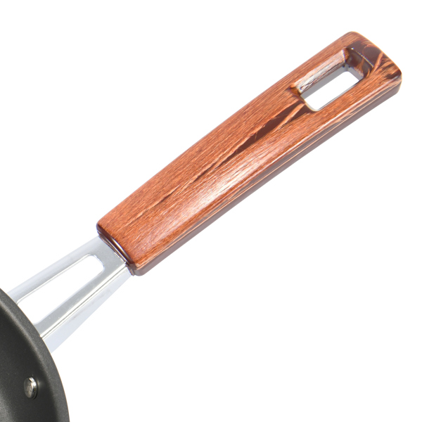 ハンドルに穴が空いており、キッチンまわりのフックに掛けて収納できます。フェノール樹脂を使用し、耐熱性に優れています。木目風で温かみのあるデザインです。