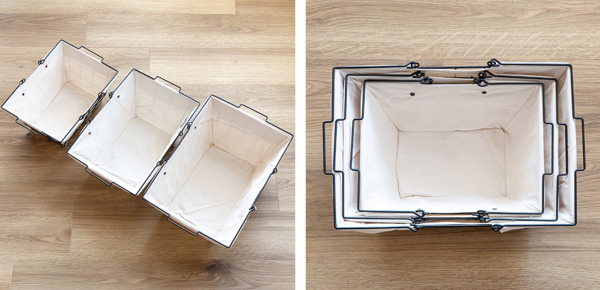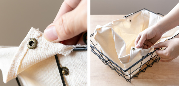 布はボタンで留められているため用途に合わせて取り外せます。布を外して、かっこいいブラックのアイアンバスケットとしても使用できます。