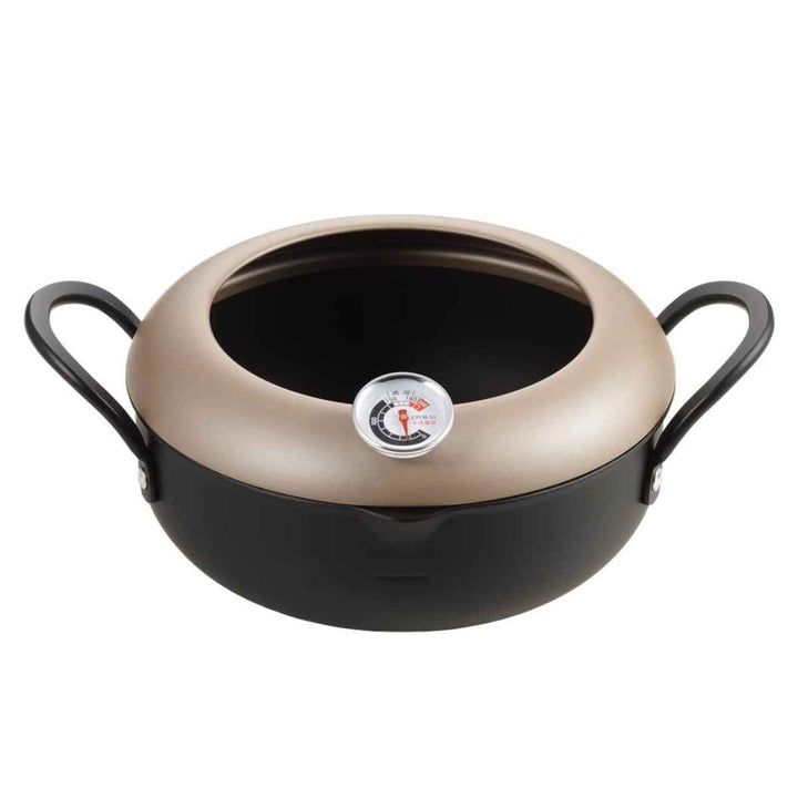温度計付きの鉄製天ぷら鍋です。温度計付きで揚げ頃が分かりやすいので、美味しく仕上がります。ブラックを基調としたシックなデザインです。ガスはもちろん、200VのIHやあらゆる熱源に対応しています。