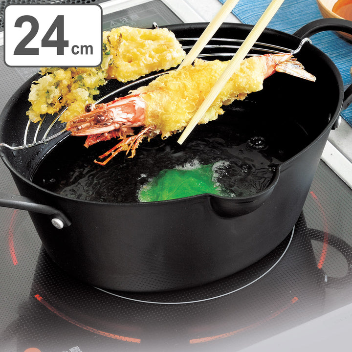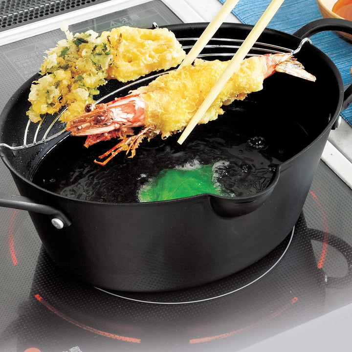 横長の楕円形状でエビフライやトンカツなどが揚げやすい天ぷら鍋です。アスパラやナスなど細長い食材を揚げる時に便利なので、料理のレパートリーが広がります。揚げ物のちょっと置きが出来るアミ付きです。