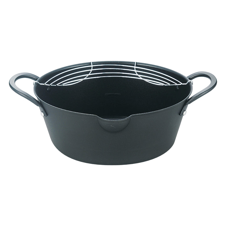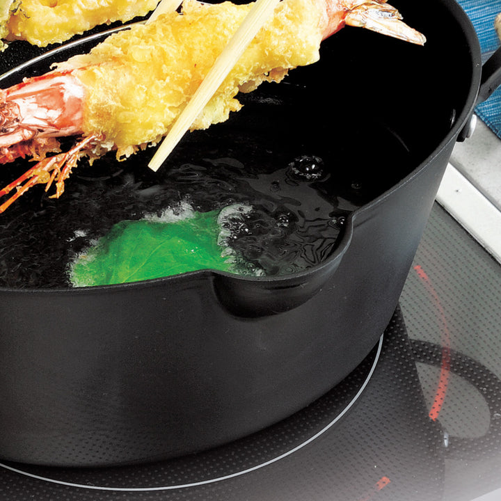 底面に向かって傾斜をかけたスリム形状で少ない油量で揚げられます。熱伝導率が良い鉄製なので揚げ物がカラッと美味しく揚がります。また、底厚2mmなので油の温度が下がりにくいです。
