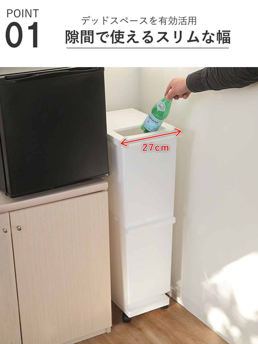 ゴミを分別して捨てる事ができるスリムな縦型のダストボックスです。冷蔵庫横やシンク周りのデッドスペースを有効活用できます。