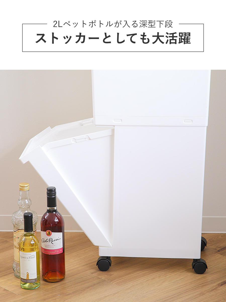 下段はゴミ箱としてだけでなく、収納ストッカーとしても活躍します。開閉しやすく、広めの開口部で食品のストックにも最適。十分な深さがあるため、長めの瓶や2Lペットボトルなどもすっきり収納できます。