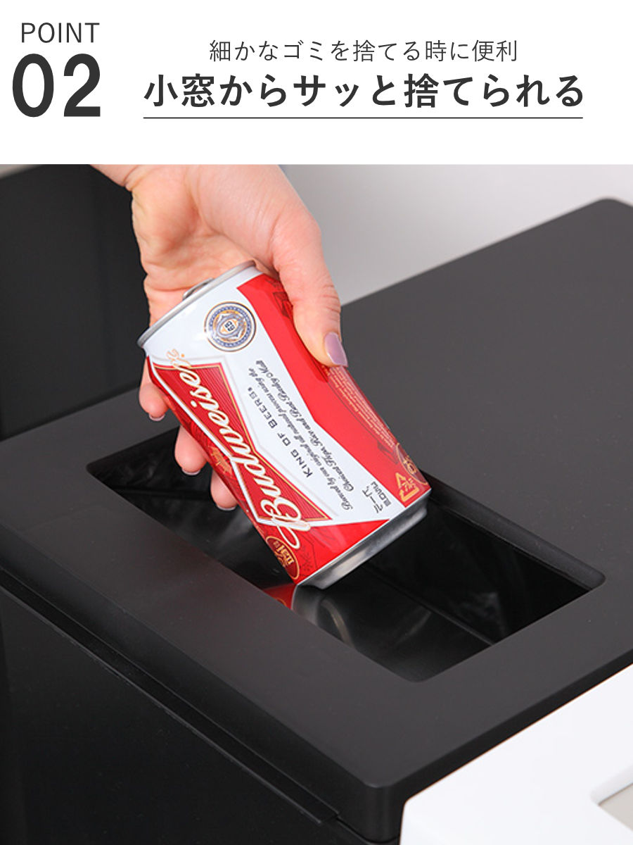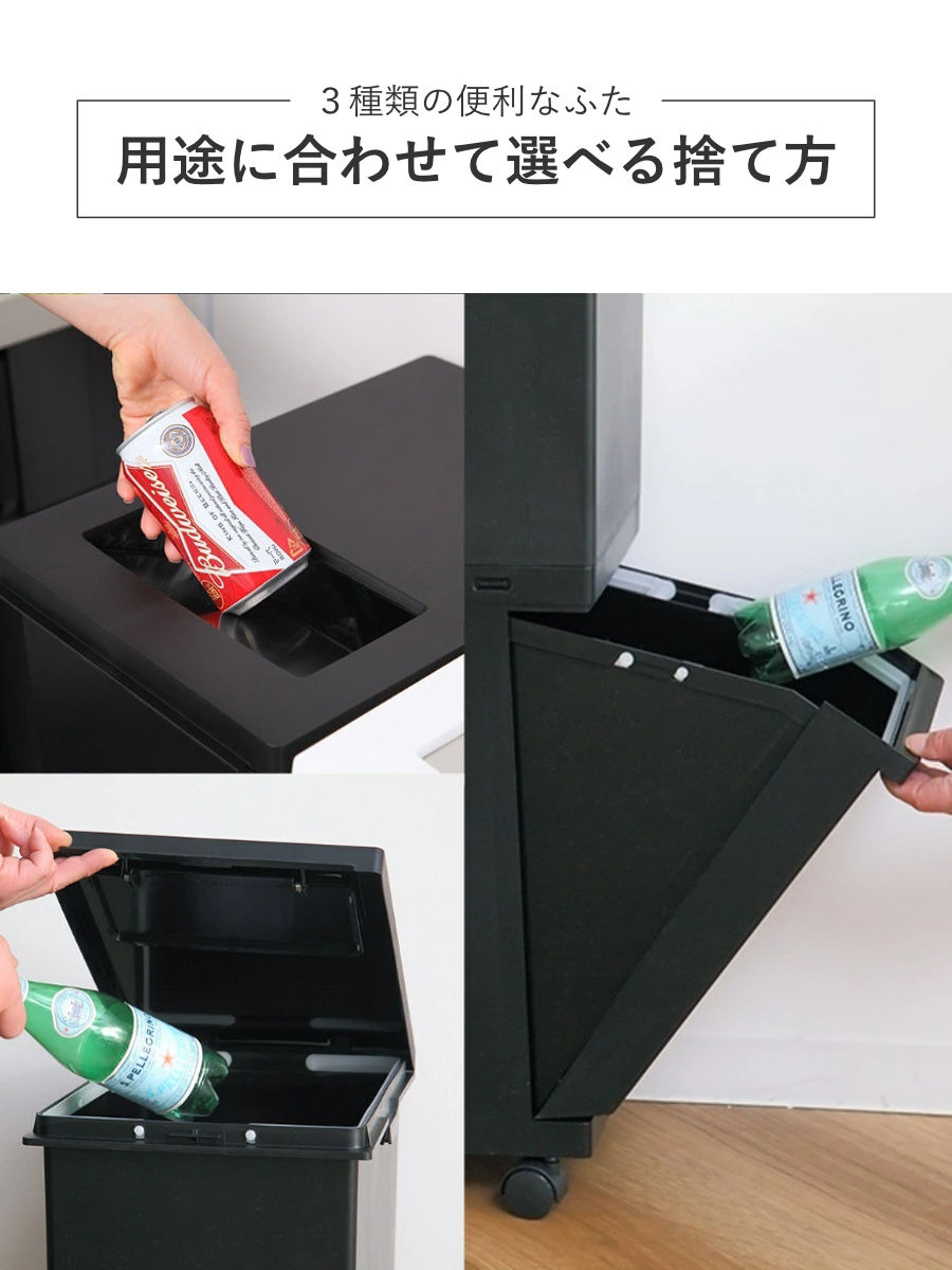 上段はプッシュ式の小窓で細かいゴミをサッと捨てられます。大きなゴミはフタを開けてラクに投入、下段は前開きタイプでかさばるゴミもスムーズに捨てられます。3種類のフタで分別も簡単、毎日のゴミ捨てがもっと快適になります。