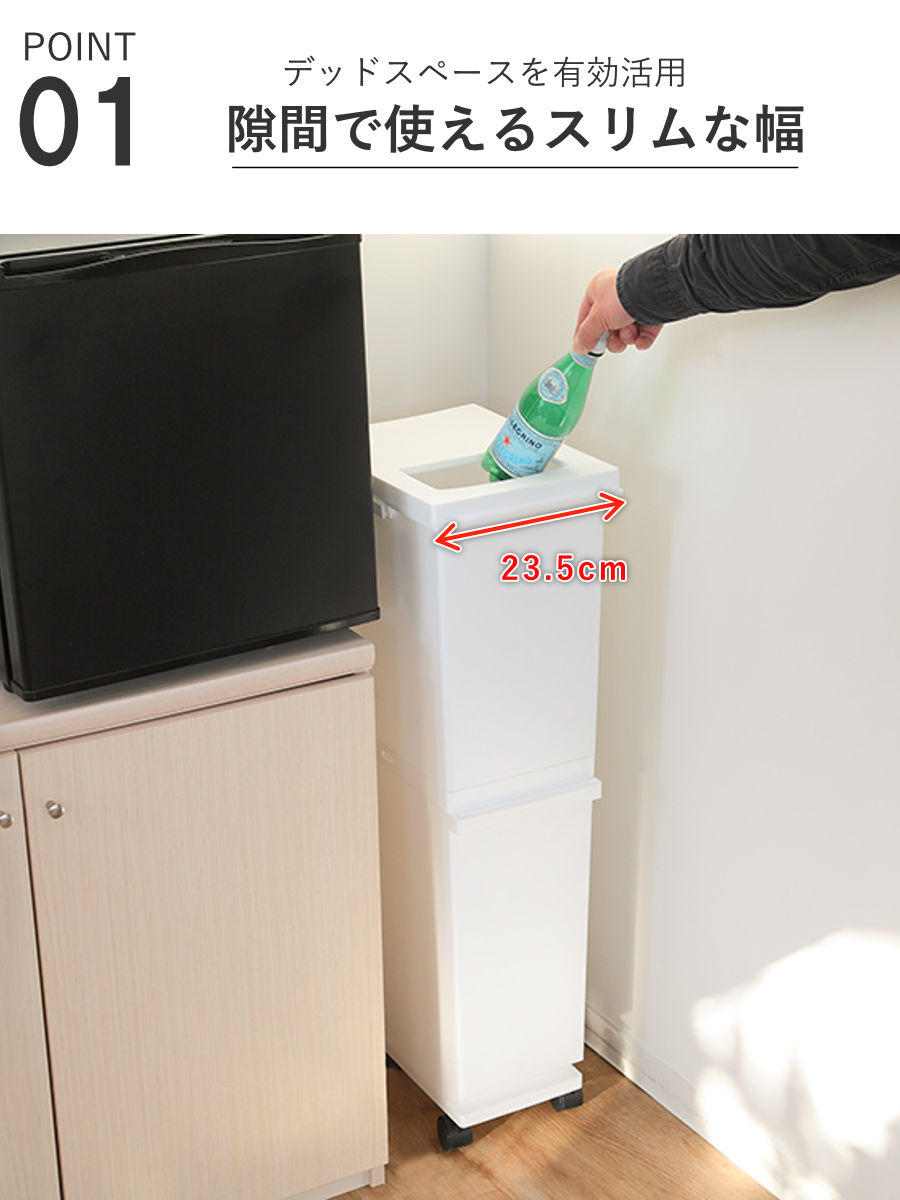ゴミを分別して捨てる事ができるスリムな縦型のダストボックスです。冷蔵庫横やシンク周りのデッドスペースを有効活用できます。