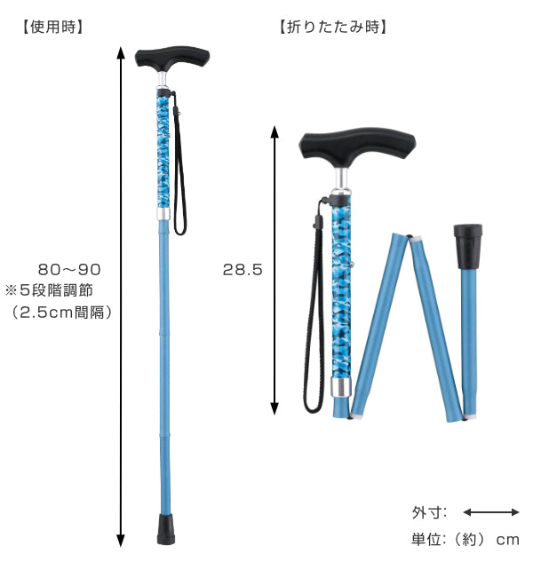 | サイズ | 長さ 約80〜90(cm)※伸縮5段階調節(2.5cm間隔) 折りたたみ時:長さ 約28.5(cm) 杖先ゴム:直径1.6(cm) |