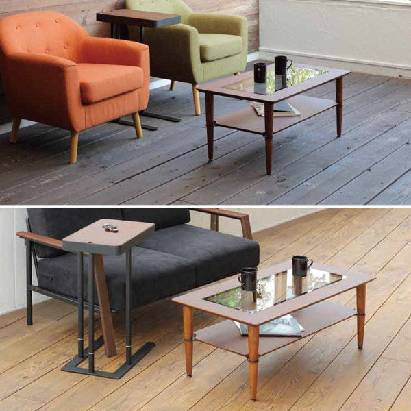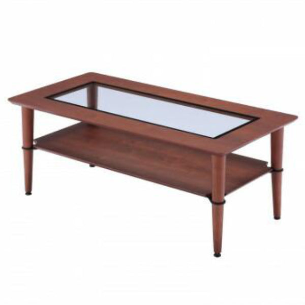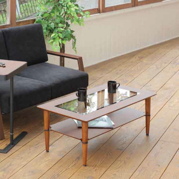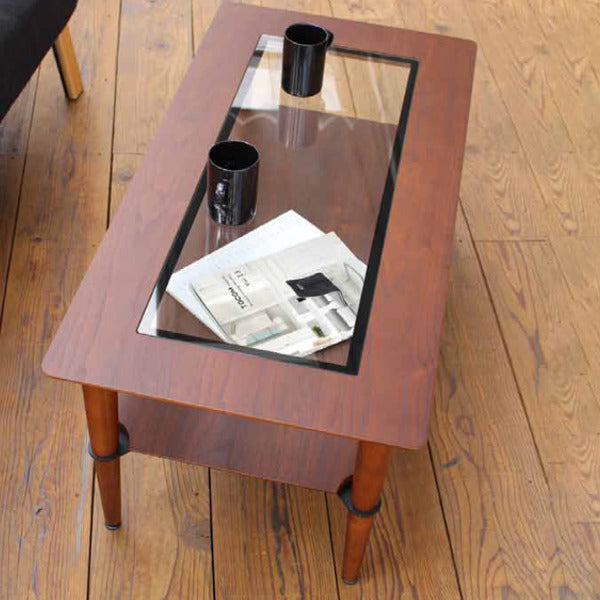 天板と棚板にウォールナットの突板を使用し、中央に10mmの強化ガラスをはめ込んだリビングテーブルです。落ち付いた木目の風合いとガラス天板の光沢がカジュアルすぎない高級感を与え、落ち着いたお部屋を演出します。