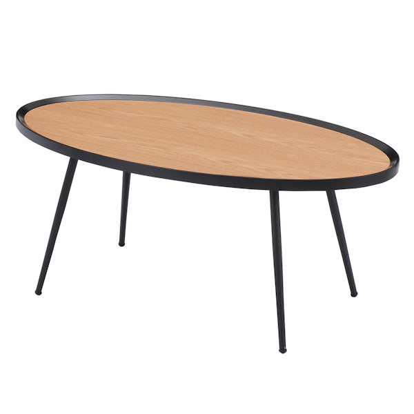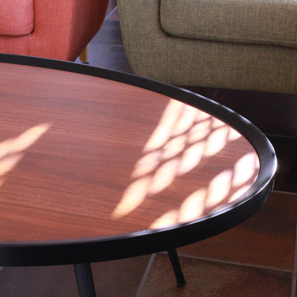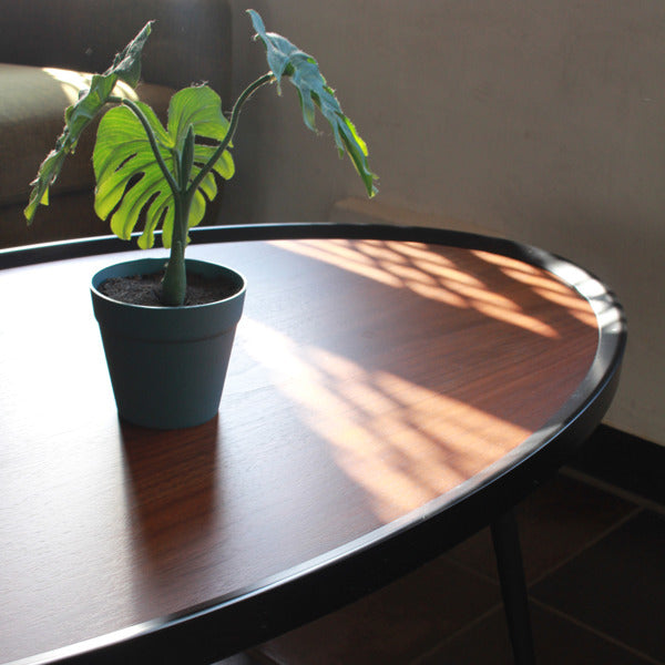 天然木の天板にエッジのブラックが冴える、美しいリビングテーブルです。粉体塗装を施した脚部がヴィンテージ感を演出し、調和のとれたモダンなデザインになっています。