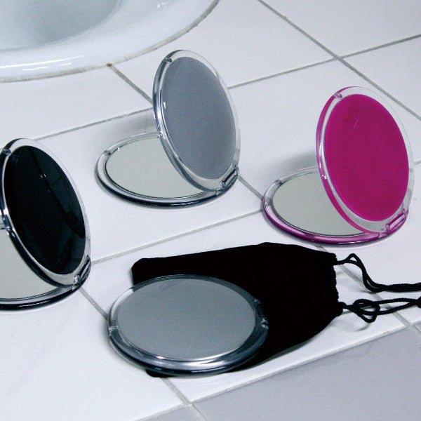コンパクトを開くと両面がミラーになっています。片側は拡大鏡なので、メイクなどでしっかりと顔を見たいときに便利です。また、持ち運びに便利な収納袋が付いています。