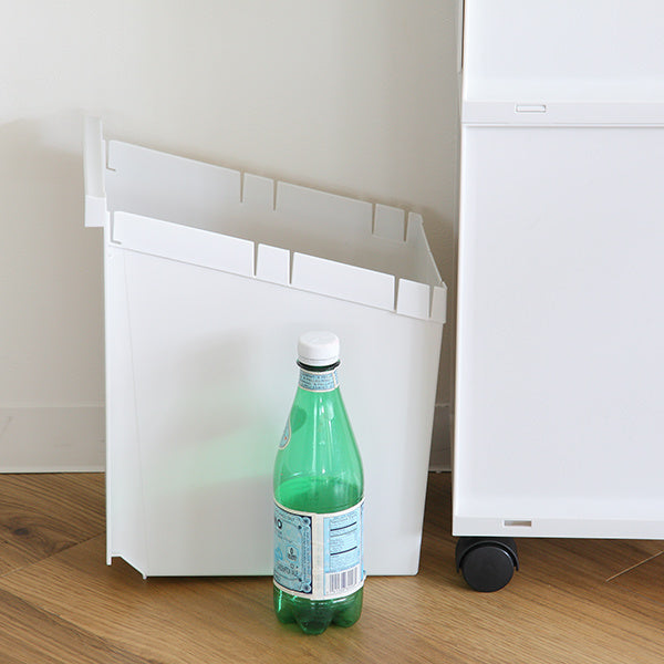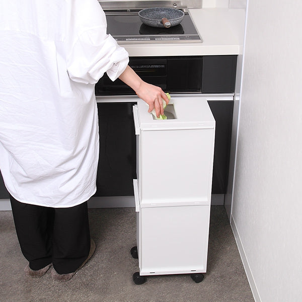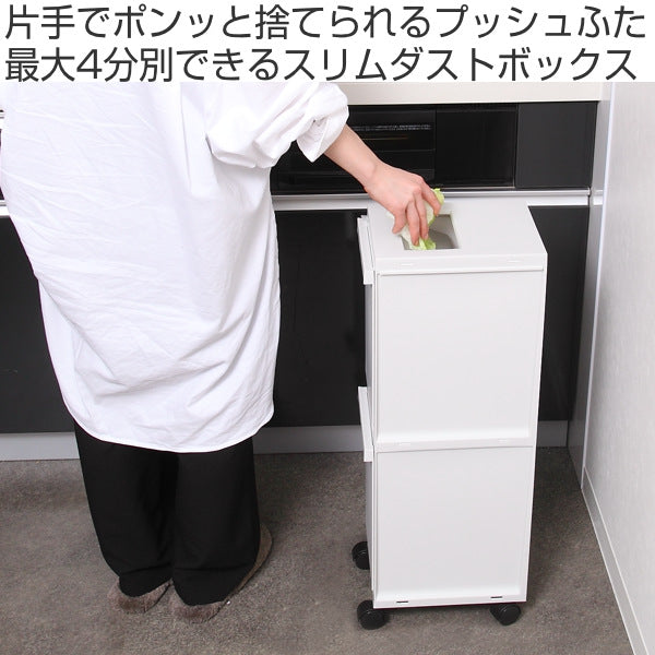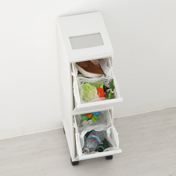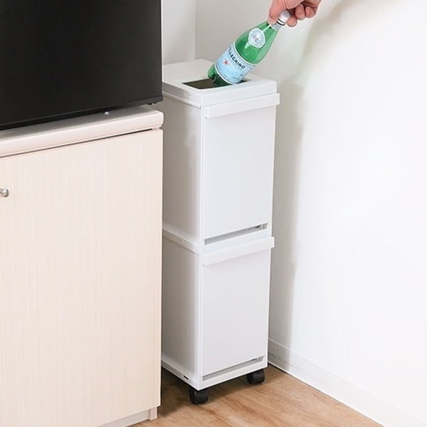 スリムタイプのダストボックスでちょっとした隙間にも収まり空間を有効に使えます。引き出し内にスリットがあり1段で2分別できます。最大4分別まで可能です。前開きタイプなのでラック下などのスペースに収納することも可能です。省スペースで細かく分別したい方におすすめです。