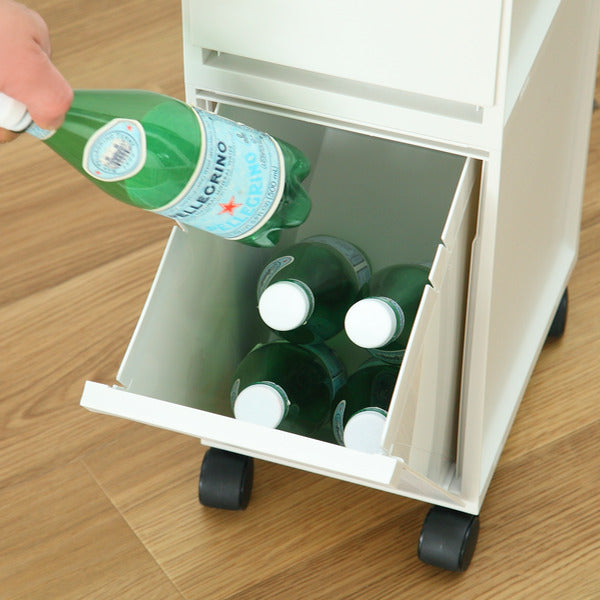 キッチン周りに置いて水や保存食等の保管や、洗面所に置いて洗剤類などストッカーとしても使用できます。引き出し容量は約10Lで、500mlのペットボトルを約9本、350mlの缶を約13本入れることができます。