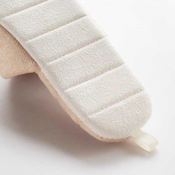 従来のシリーズにはなかった、洗濯ばさみでつまめるタグがかかとに付いています。干す時に本体をつままなくて良いので、スリッパ全体をムラなく均一に乾かすことが出来ます。また、洗濯ばさみの跡が付いたり、つまんだところだけボリュームが無くなったりする心配がいりません。
