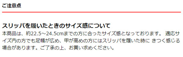 本商品は、約22.5~24.5cmまでの方に合ったサイズ感となっております。 適応サイズ内の方でも足幅が広め、甲が高めの方にはスリッパを履いた時に きつく感じる場合があります。ご了承の上、お買い求めください。