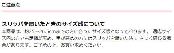 本商品は、約25~26.5cmまでの方に合ったサイズ感となっております。 適応サイズ内の方でも足幅が広め、甲が高めの方にはスリッパを履いた時に きつく感じる場合があります。ご了承の上、お買い求めください。
