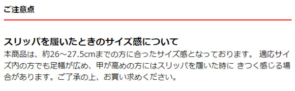 本商品は、約26~27.5cmまでの方に合ったサイズ感となっております。 適応サイズ内の方でも足幅が広め、甲が高めの方にはスリッパを履いた時に きつく感じる場合があります。ご了承の上、お買い求めください。