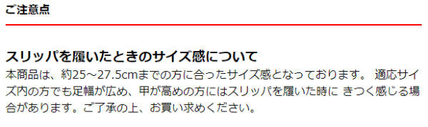 本商品は、約25~27.5cmまでの方に合ったサイズ感となっております。 適応サイズ内の方でも足幅が広め、甲が高めの方にはスリッパを履いた時に きつく感じる場合があります。ご了承の上、お買い求めください。