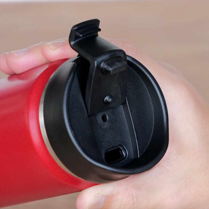 ふた付きなのでホコリが入りにくく、ふたにはストッパーが付いているので飲んでいる時に落ちてこないようになっています。