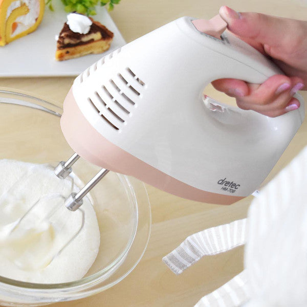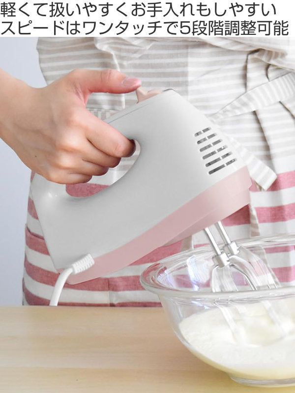 生クリームの泡立てやケーキづくりに便利なハンドミキサー。本体の重量が約740gと軽くて扱いやすいからお菓子づくり初心者の方におすすめです。空気を取り入れてふわっとしたきめ細かいクリームに仕上げ、つややかなふんわりクリームが簡単につくれます。