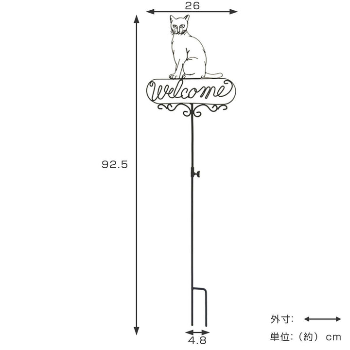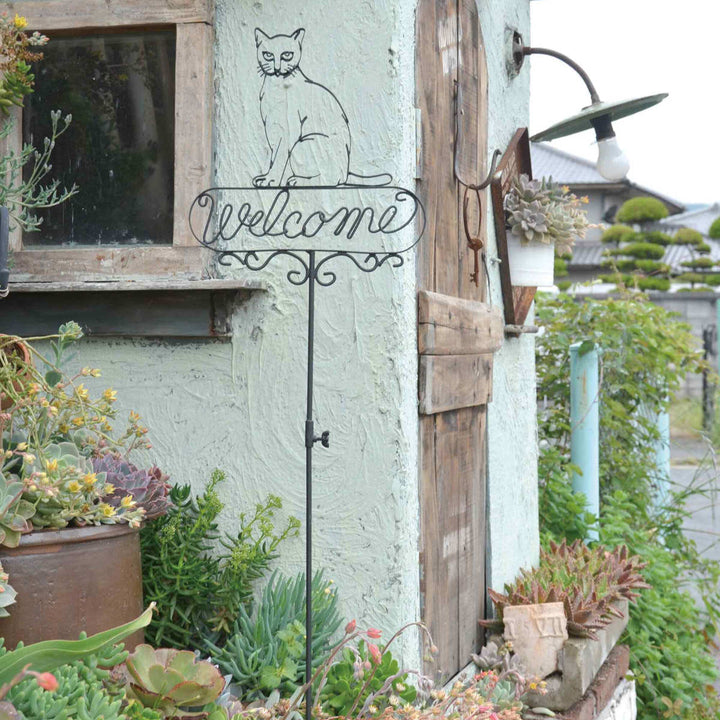 「Welcome」と書かれた、アイアン製のしっかりとした造りのガーデンスティックです。お庭に刺せば、猫がお客様をお出迎えしてくれます。