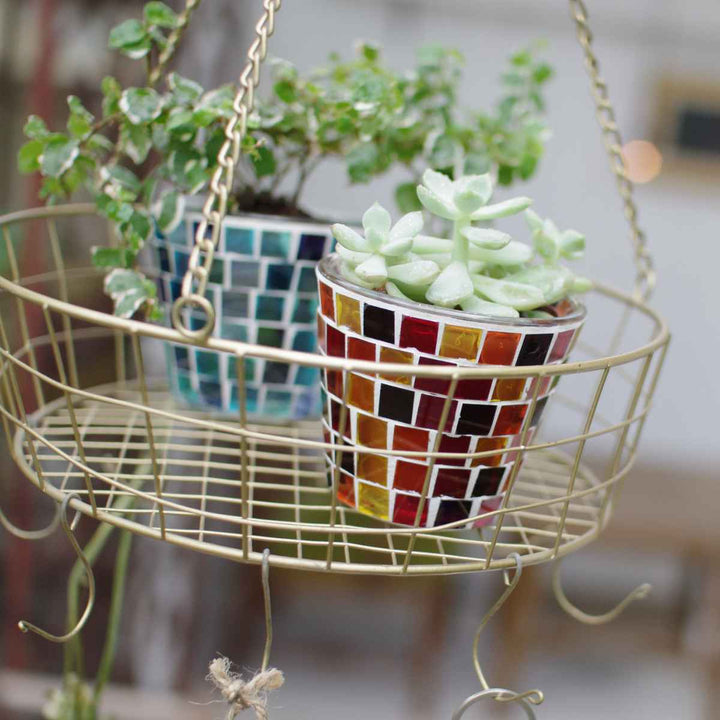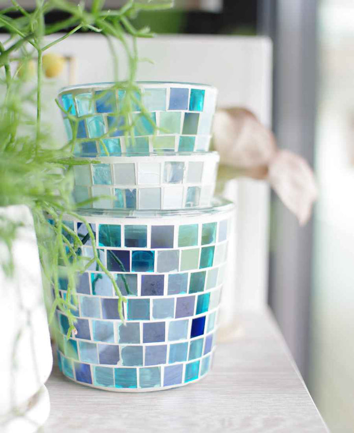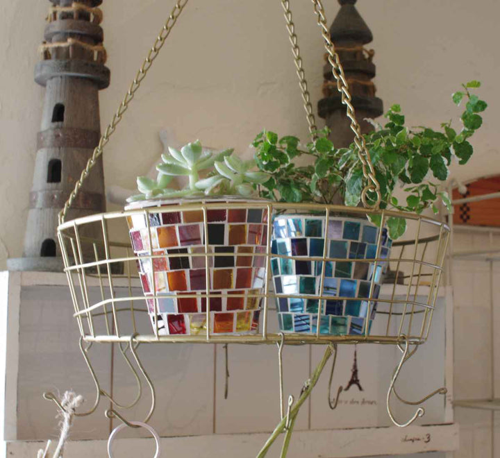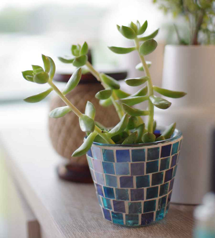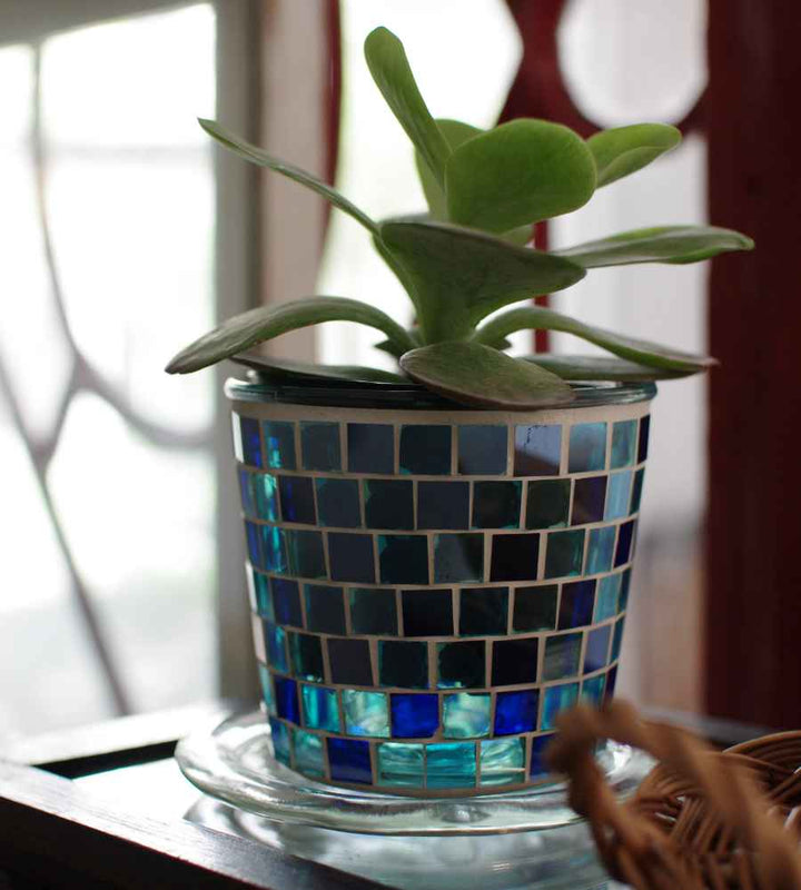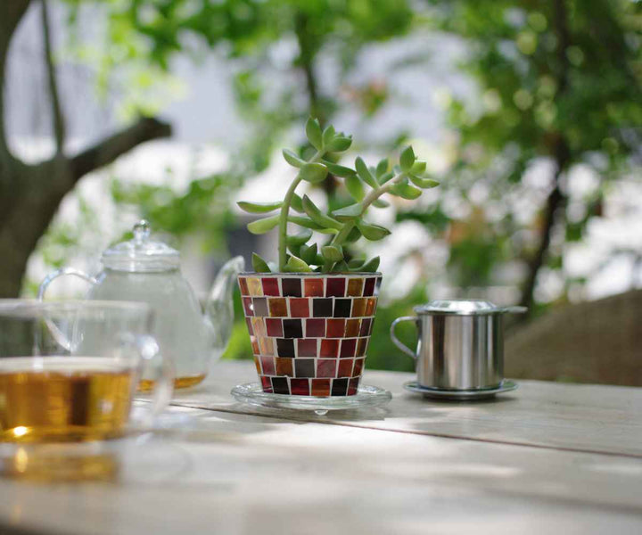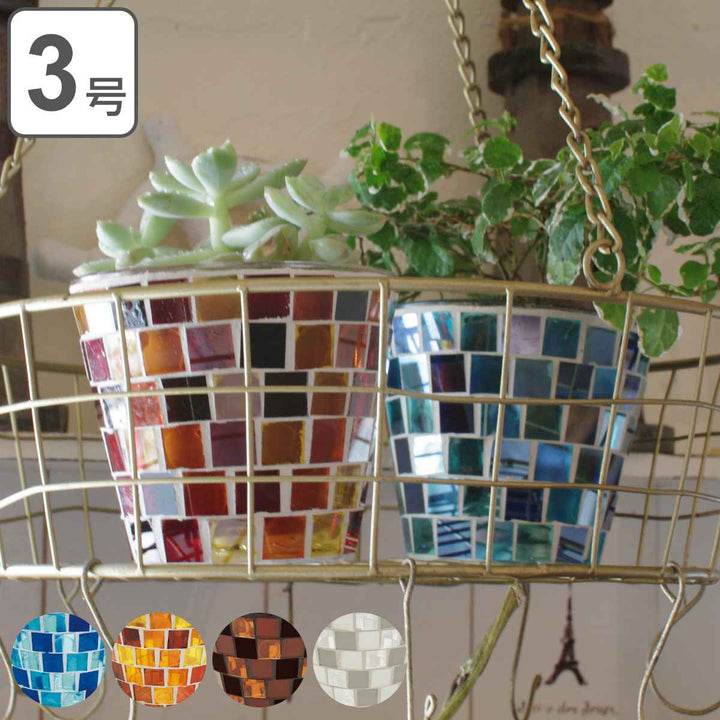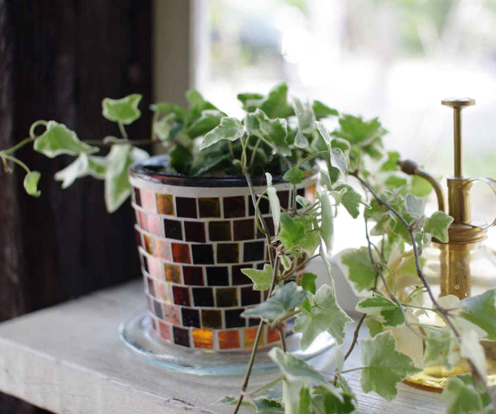 太陽の光を受けてキラキラと輝くモザイクガラスがキレイなプラントポットです。職人が一枚一枚、貼り付けた透明感のある模様は少しずつ表情が異なります。手作業のため、色や形などに個体差が生じる場合がありますが、個々の特徴としてお楽しみください。