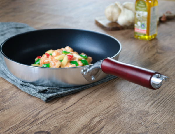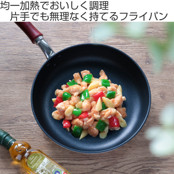 天然木の取っ手とシルバーの外観が、インテリアにも馴染むおしゃれなフライパンです。鋳造製品なので、側面より底面を厚く造ることができ、均一な熱の伝わりと軽さを両立させました。2~3人分の炒め物などの調理に使いやすく、普段使いに便利なサイズです。
