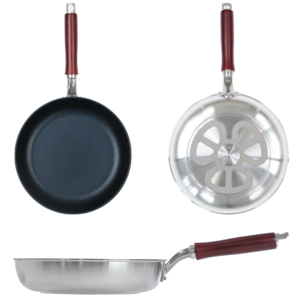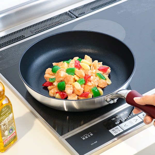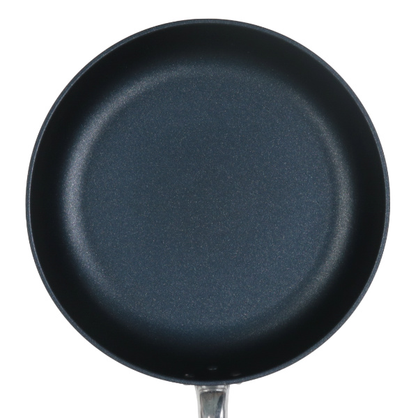 底はIH対応のステンレスと一体になっているので、はがれる心配がなく、変形に強い丈夫な造りになっています。内面は、スイスのコーティングメーカーILAGがプロ向けに開発したマルチポリマー3層コートのプロフェショナルSコーディングなので、非粘着性と耐久性に優れています。