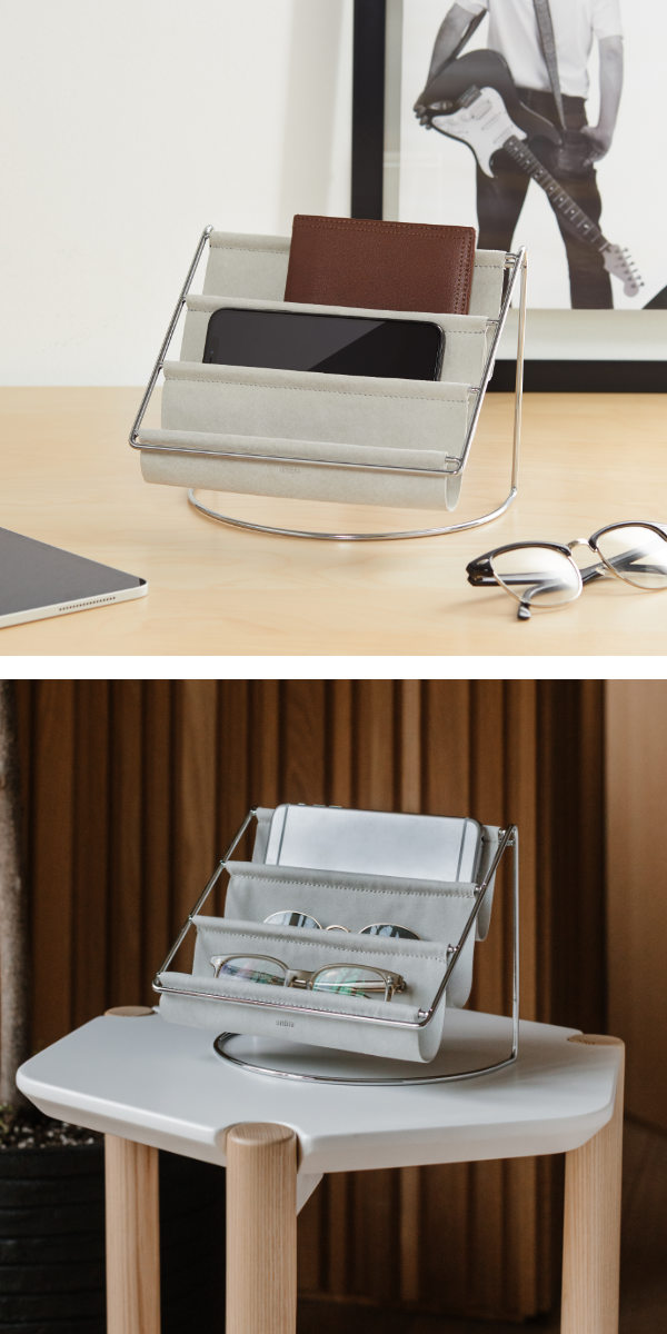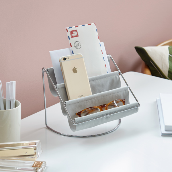 丈夫なワイヤーフレームとスエードのようなマイクロファイバー生地のポケットが特徴のスタイリッシュな卓上収納ハンモックで、日常の必需品をスタイリッシュに収納することができます。メガネやサングラス・スマートフォン・タブレット・リモコン・手紙などの小物収納に最適です。