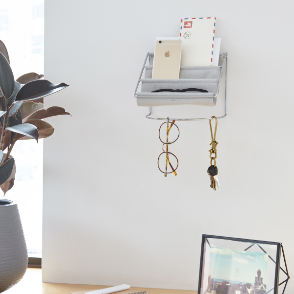 置いて使うだけではなく、壁に掛けてもお使い頂けます。その場合は、半円の脚部分にサングラスやメガネ、鍵などを引っ掛けられます。玄関先でキーフックとしても活用でき、郵便物や印鑑、マスク等も一緒に収納できるので便利です。