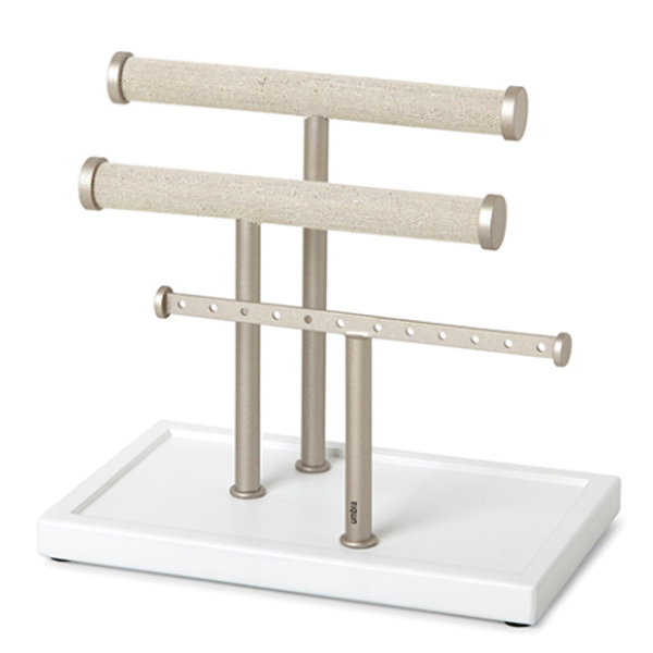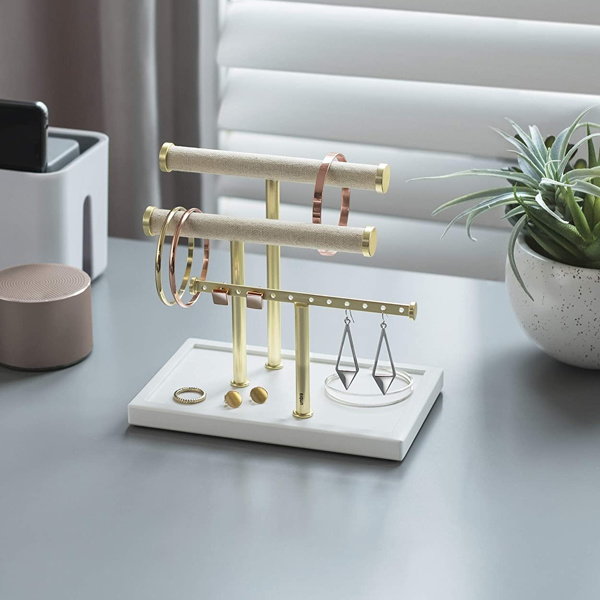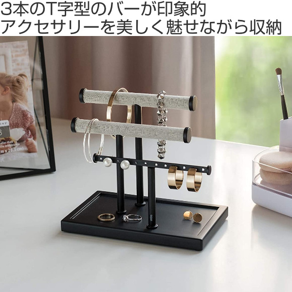 長さが異なる3本のT字型のバーが印象的なブレスレットバーです。ピアス・ブレスレット、時計等を引っ掛けてお店のディスプレイのように飾りながら収納できます。