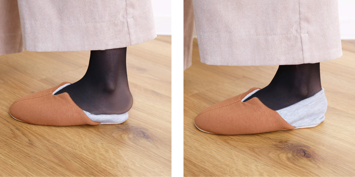 かかと部分は伸縮性があり折りたたんで履けるので、脱ぎ履きがしやすく日常使いに便利です。災害時には、かかとのゴムをサッと被せるだけで防災スリッパになります。