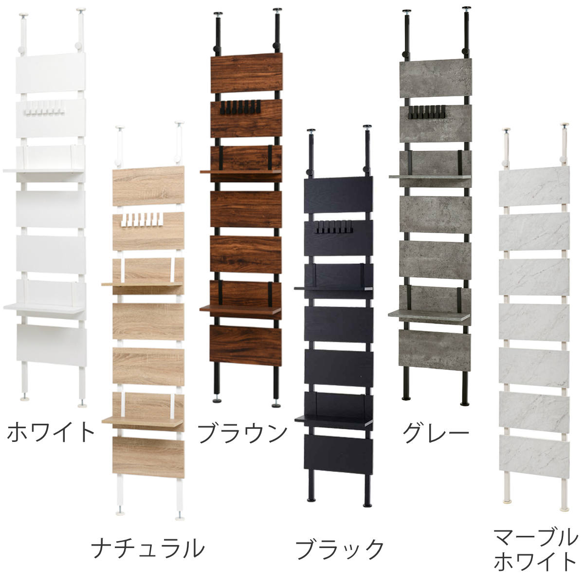壁面に設置できる突っ張り式のウォールラックです。フックと棚板が付属しているので、設置するだけで手軽に収納力がアップします。天井や壁に穴を空けるなどの工事が不要なので、賃貸住宅にお住まいの方にもおすすめです。