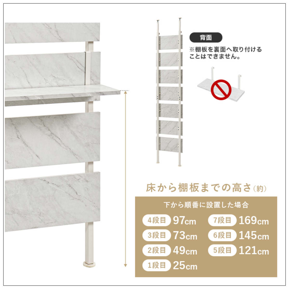 | 材質 | 棚板:メラミン樹脂化粧繊維板(ホワイト)、プリント紙化粧繊維板(ナチュラル、ブラウン、ブラック、グレー、マーブルホワイト) フレーム:スチール(粉体塗装) |