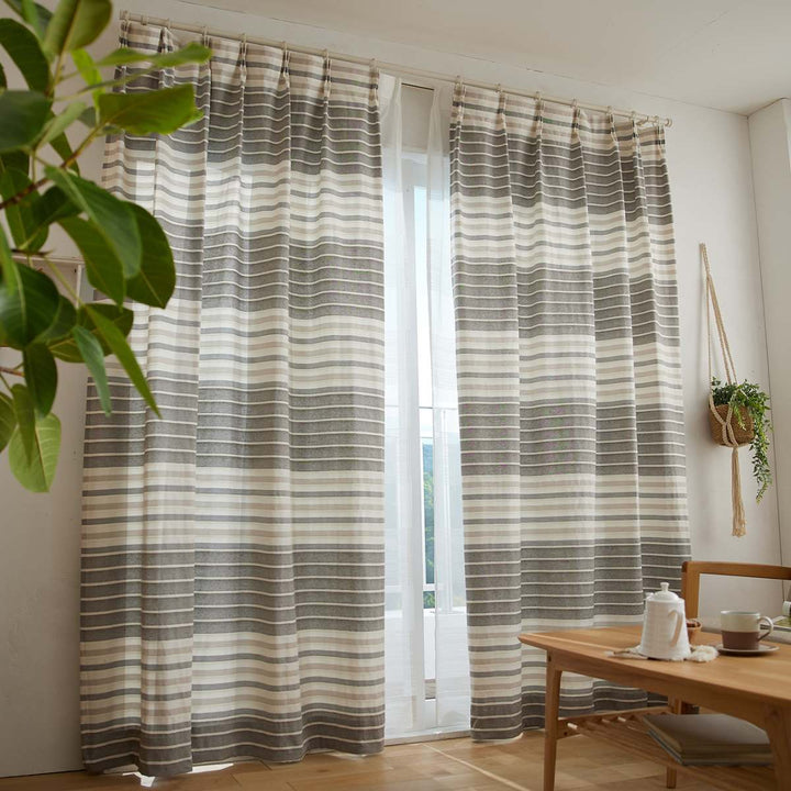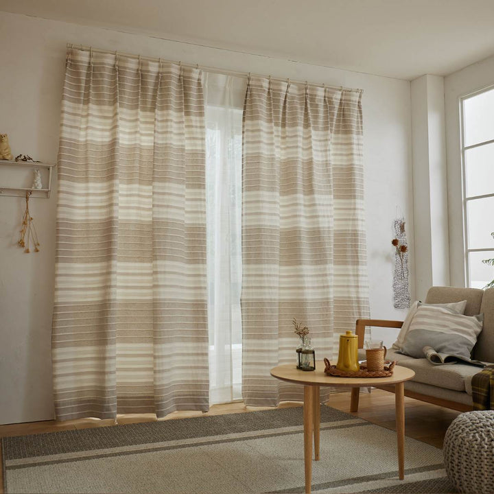 天然素材と化繊が織りなす優しい雰囲気が魅力的で、太陽の光を心地よく感じる生地感です。カーテンと同柄のタッセルが付属しています。