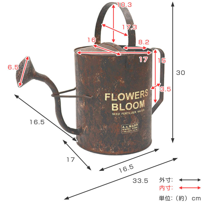 ヴィンテージ風のこだわり抜かれた加工が目を惹くジョウロです。ジョウロとしてお使いいただくことはもちろん、中にドライフラワーなどを入れて飾りとして使うことも出来ます。