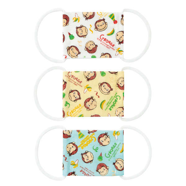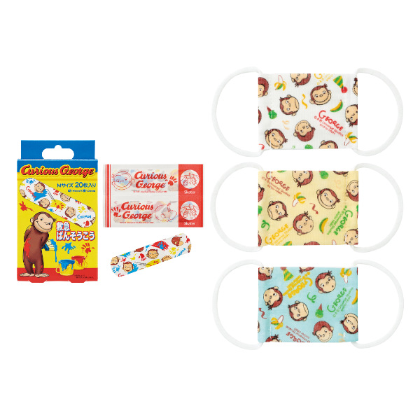 ポップなおさるのジョージのイラストがプリントされた子ども用マスク3枚とばんそうこう1箱のセットです。花粉・ホコリ・風邪対策に活躍する優しい肌触りのマスクは白、黄、青の3色入りです。ケガをしてしまった時も大好きなキャラクターのばんそうこうが傷口を守ってくれます。
