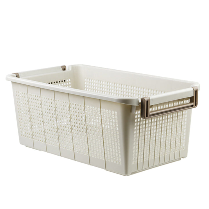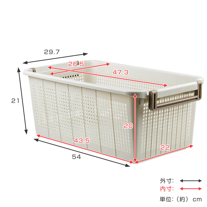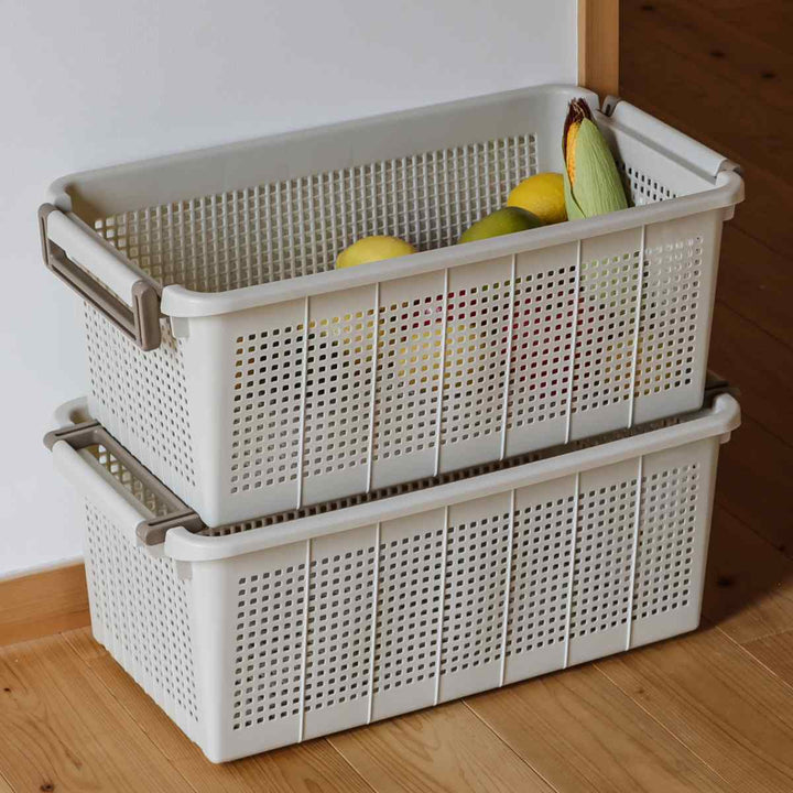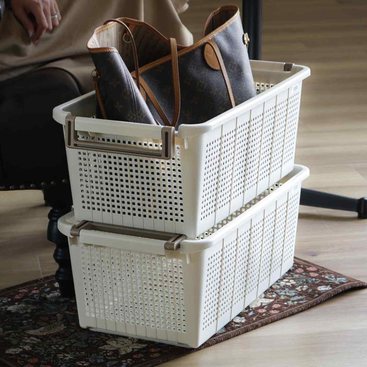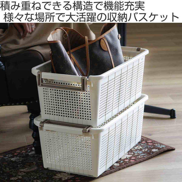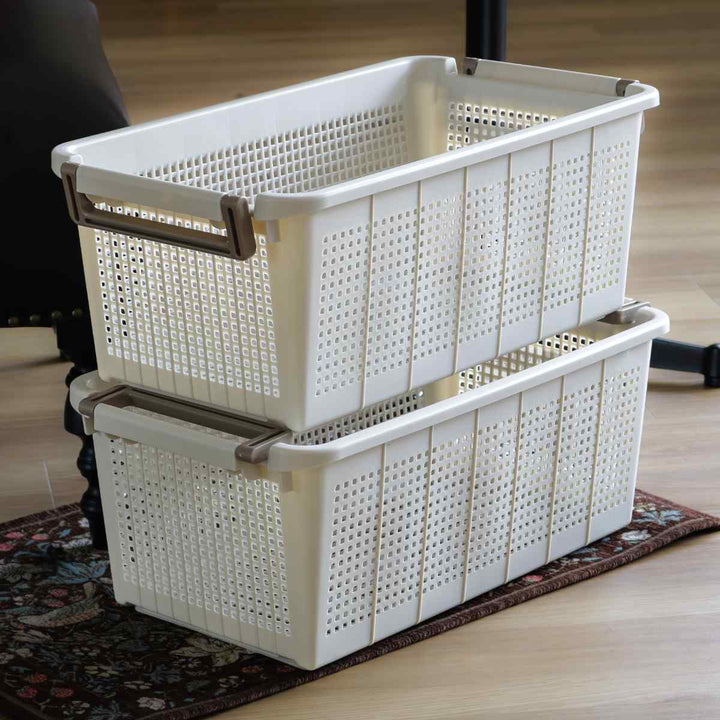 積み重ねができる構造の収納バスケットです。縦のスペースを有効活用できて便利です。2段積み重ねた時の高さは約42cmです。