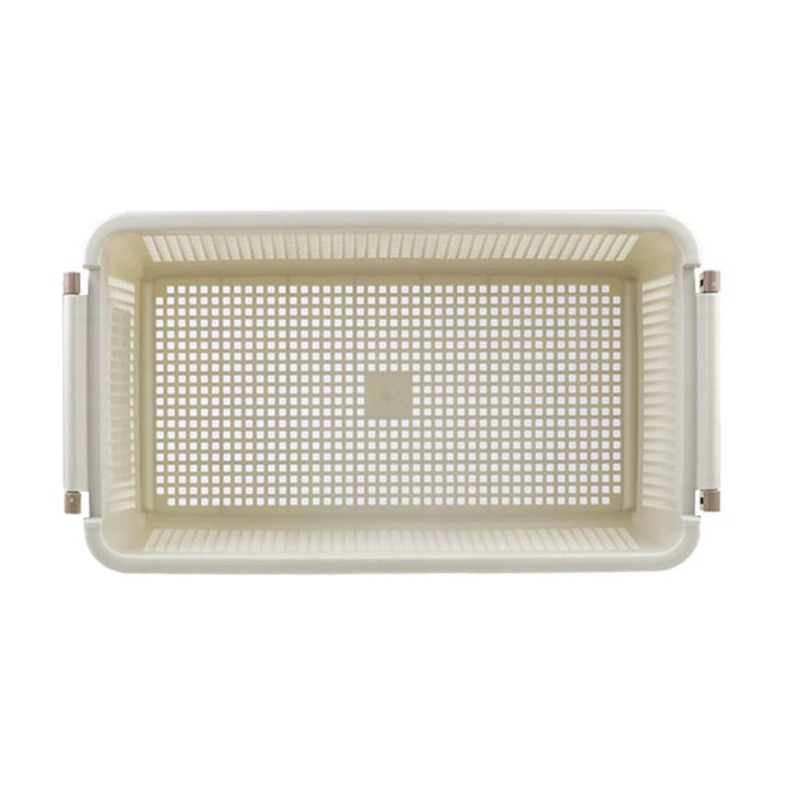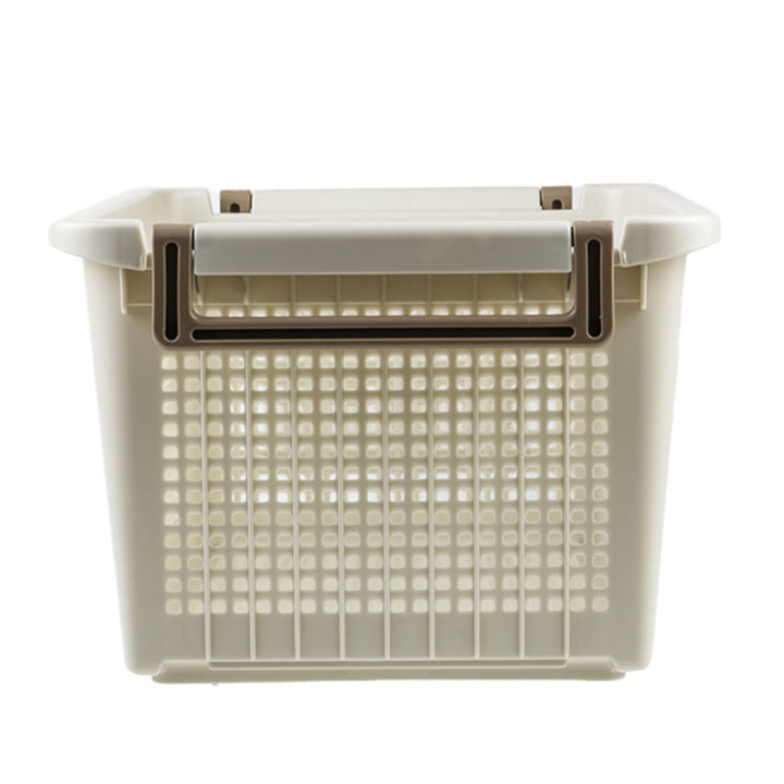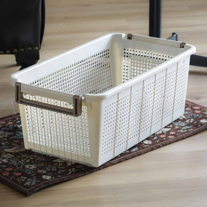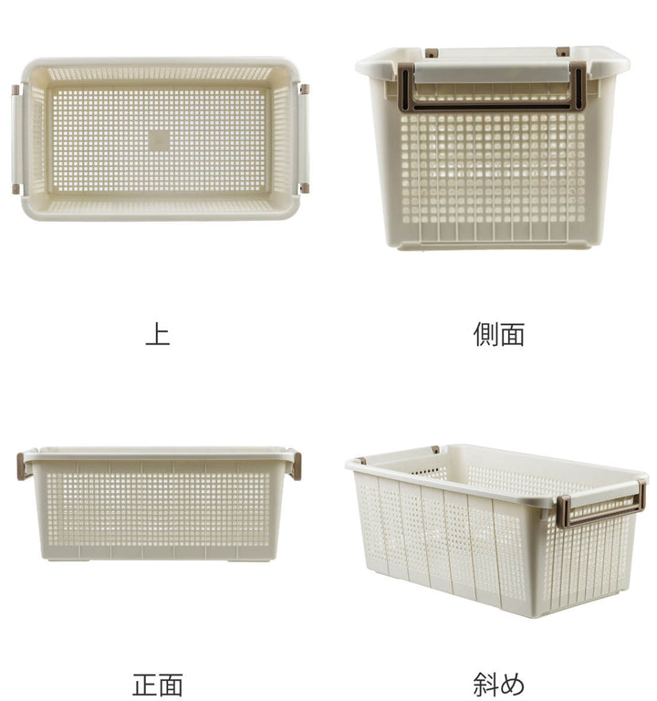 収納バスケットには取手があるので持ち運ぶ際に便利です。積み重ねて使用する際は、画像のように取手を内側に倒してお使いください。