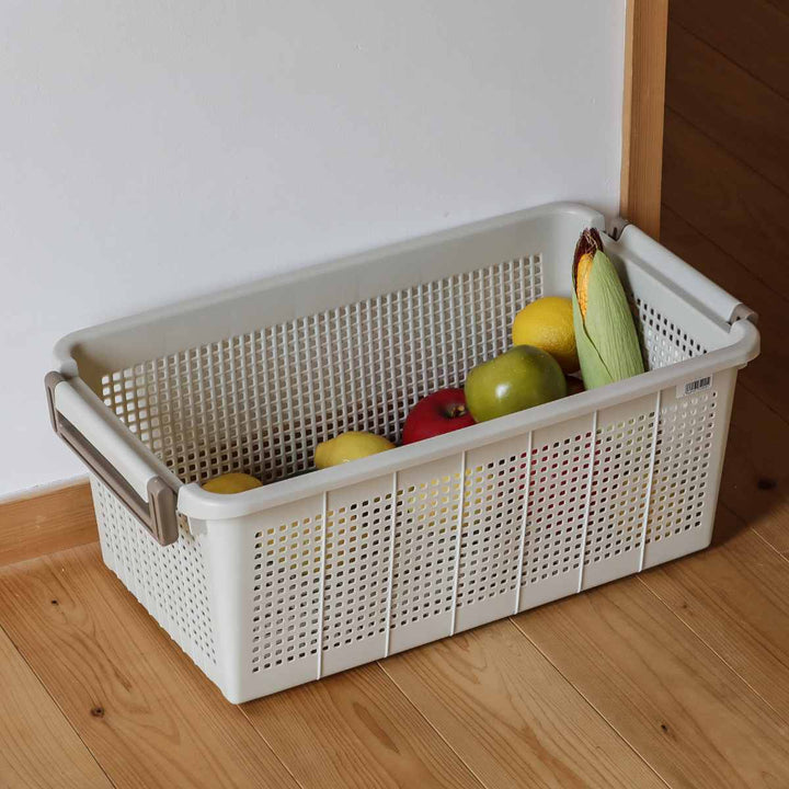 収納バスケットは通気性が良いため、果物や野菜のストックを入れるのにちょうど良いです。中身が見えるので、どこに何を収納しているのか一目で分かります。