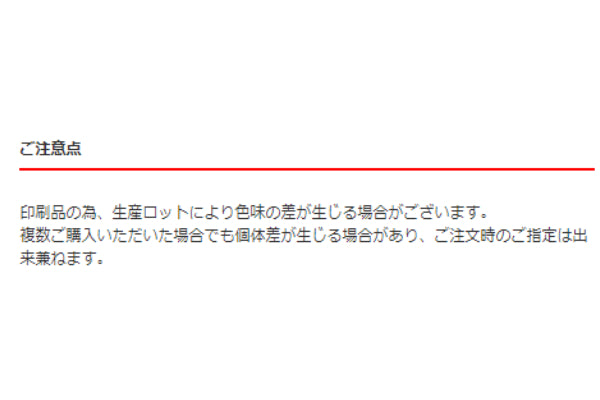 印刷品の為、生産ロットにより色味の差が生じる場合がございます。複数ご購入いただいた場合でも個体差が生じる場合があり、ご注文時のご指定は出来兼ねます。