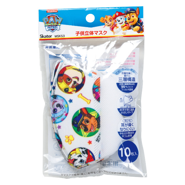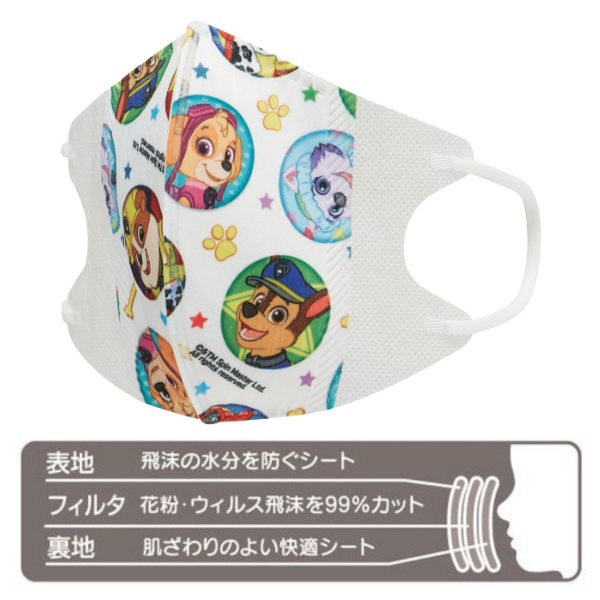 人気のキャラクター柄が可愛い、子ども立体マスクです。表地は、飛沫の水分を防ぐシート。真ん中に、花粉・ウィルス飛沫を99%カットするフィルタ。裏地は、肌ざわりのよい快適シートの「三層構造」になります。防塵効果に優れた不織布を使用しております。