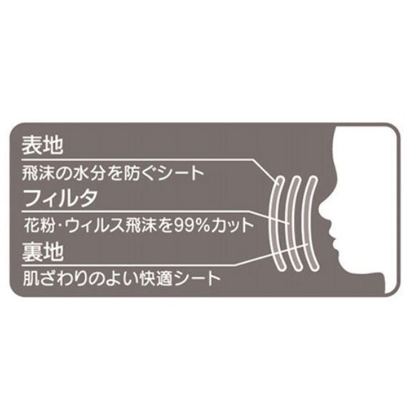 防塵効果に優れた三層構造で花粉、ウィルス飛沫を99%カットします。また立体プリーツ加工なので、口元に快適なスペースをつくり、息苦しさをやわらげます。