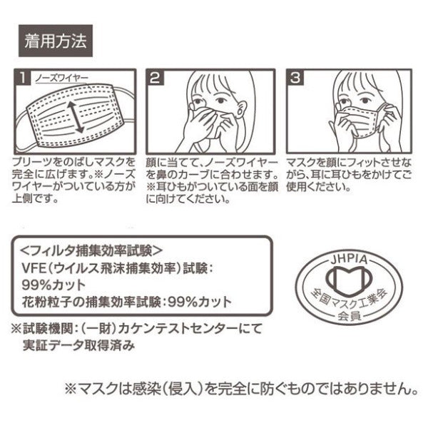 | 材質 | 表地:ポリエステル フィルタ:ポリプロピレン(メルトブロー不織布) 裏地:ポリプロピレン 耳ひも部:ポリエステル、ポリウレタン ノーズワイヤー:ポリエチレン |
