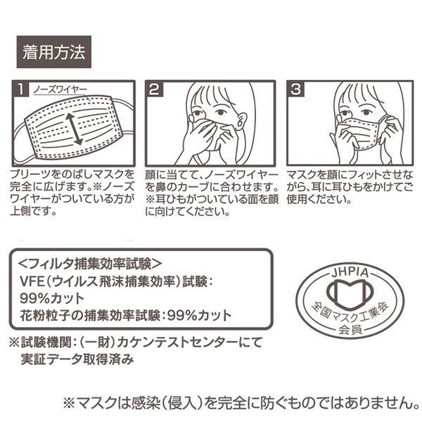 | 材質 | 表地:ポリエステル フィルタ:ポリプロピレン(メルトブロー不織布) 裏地:ポリプロピレン 耳ひも部:ポリエステル、ポリウレタン ノーズワイヤー:ポリエチレン |