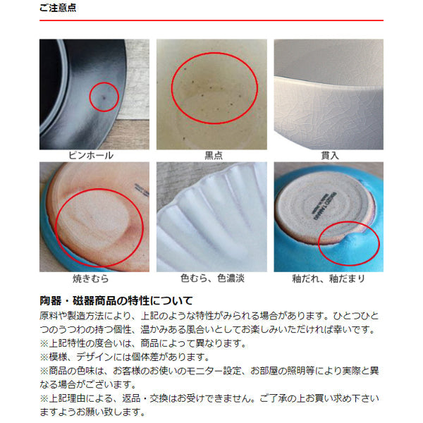 原料や製造方法により、上記のような特性がみられる場合があります。ひとつひとつのうつわの持つ個性、温かみある風合いとしてお楽しみいただければ幸いです。