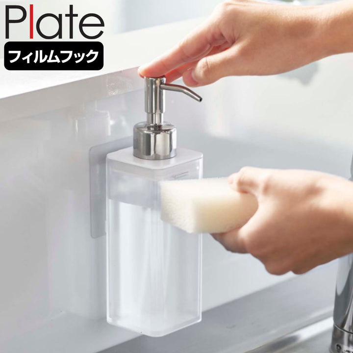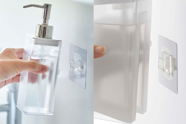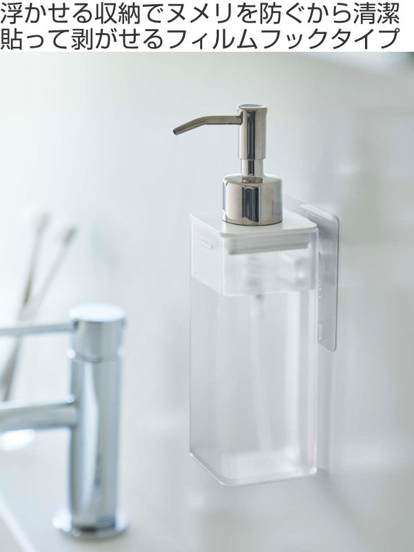 ボトル底のヌメリを防いで、水まわりのお手入れを楽にしてくれる浮かせる収納。浮かせて収納するから水はけが良く衛生的。ボトルが乾きやすく、底面のヌメリ防止になります。ディスペンサーをフィルムフックにひっかけるだけだから、手軽に設置できます。