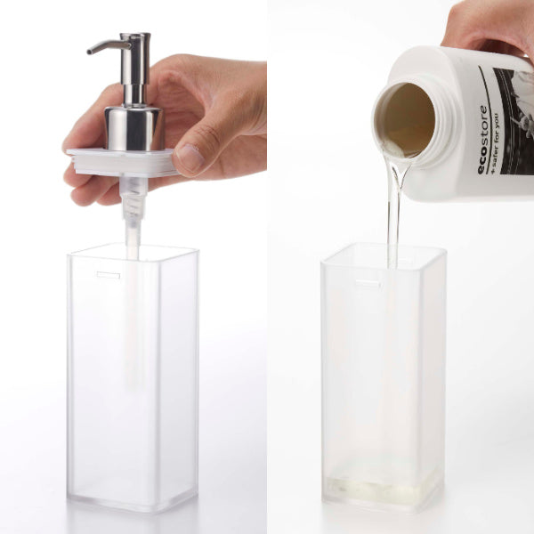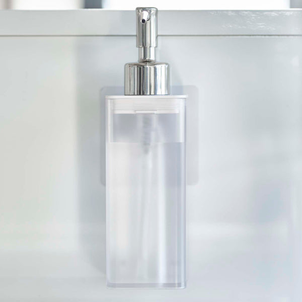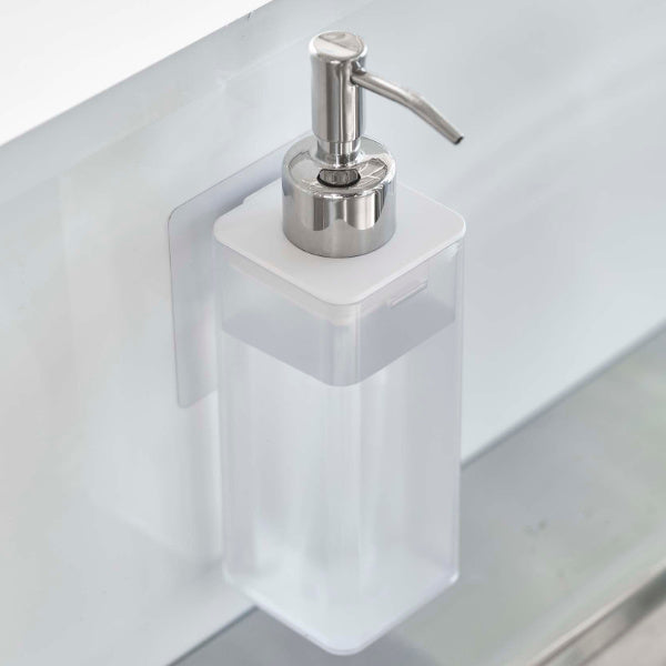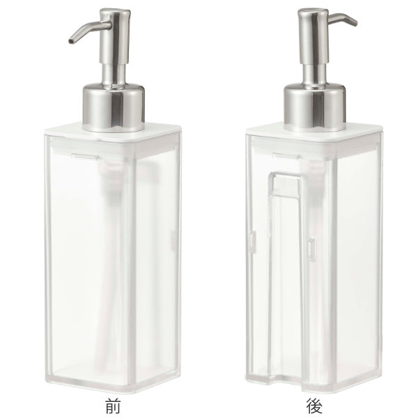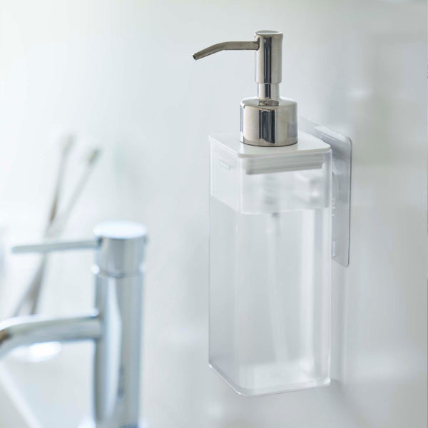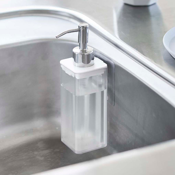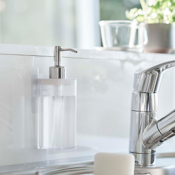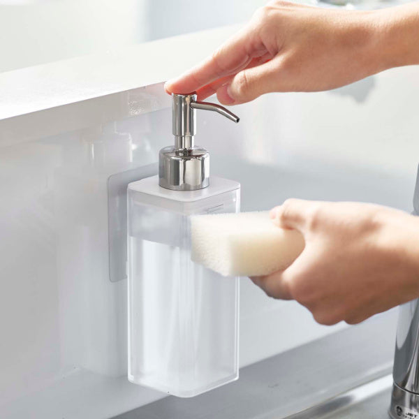 壁面につけたままポンプを押せます。そのままプッシュして使えるから、キッチンでの洗い物や洗面所のハンドディスペンサーとしても使えます。