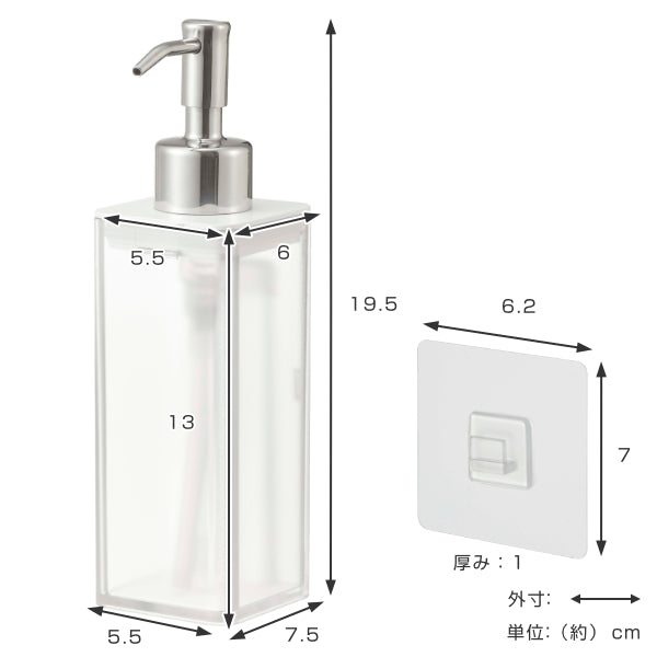 | 材質 | ディスペンサー容器・蓋:ABS樹脂、パッキン:シリコーン、ポンプ:ステンレス、パイプ:ポリエチレン フィルムフックフィルム表面・フック部分:ポリカーボネート、フィルム中面:PET、フィルム接着面:シリコーン |