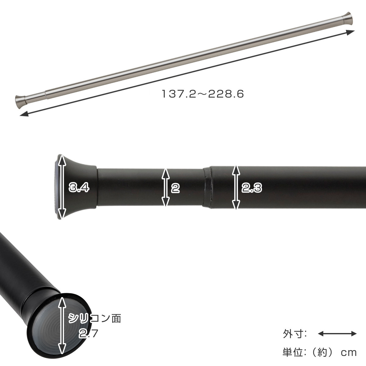 壁の穴あけやネジが不要の伸縮式つっぱり棒です。太めに作られたポールは安定感があります。カーテンポールや目隠しに使ったり、S字フックを引っ掛けて収納に使ったりと、アイデア次第で様々な使い方が可能です。キッチン、トイレ、洗面所、クローゼット、玄関など場所を問わず使えます。
