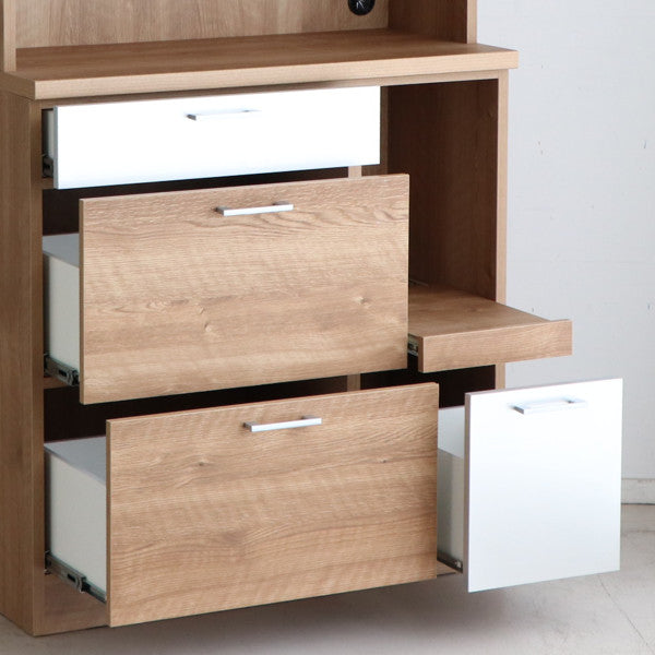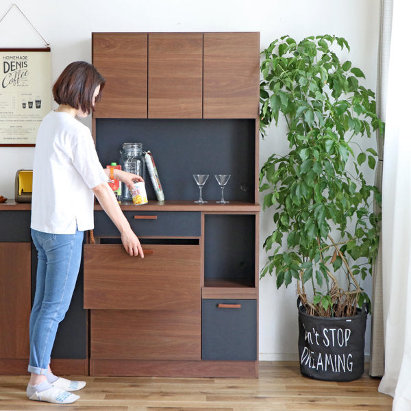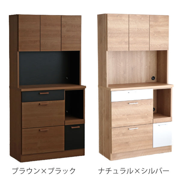 シンプルモダンなデザインで収納力も抜群の食器棚です。カラーはブラウン×ブラック、ナチュラル×シルバーの2種類、ナチュラルな木目調との2トーンカラーが上質なイメージを演出します。